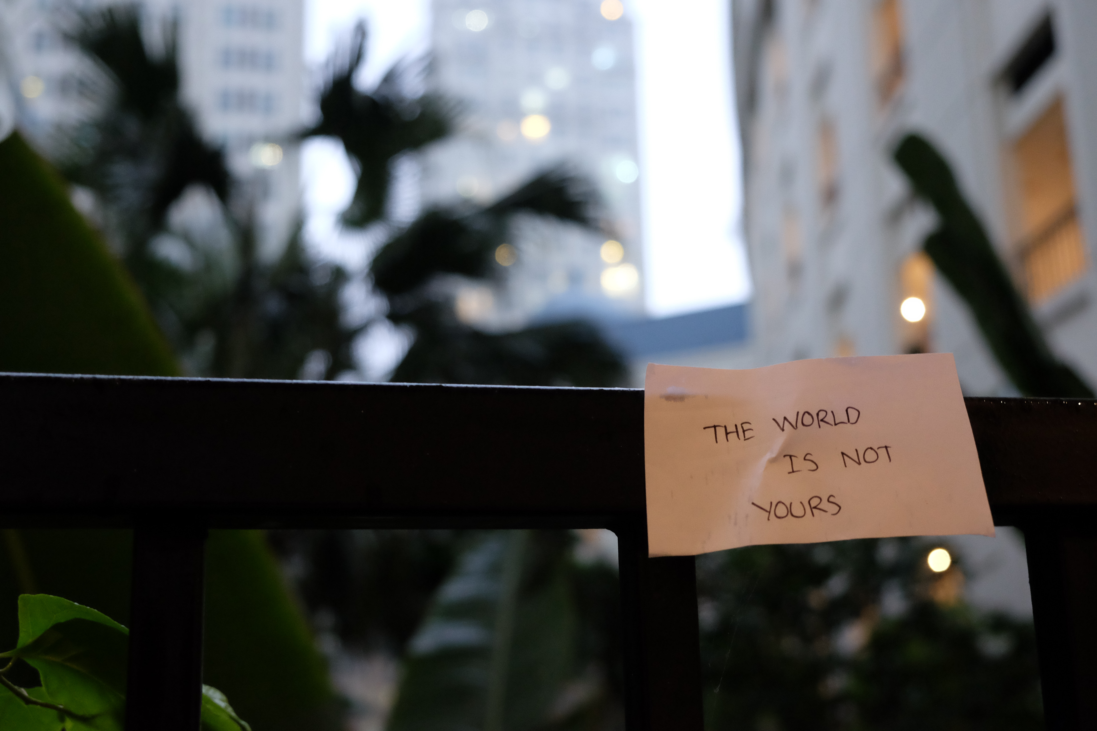 So yes, it's hard for me to feel truly free, and I don't think that true freedom will be accomplished in this lifetime. I dream of going off grid when I'm 40, raising my chickens pigs and children, growing my crops away from any street lights and boulevards. But I know that's a dream, because you have to feed into the system in order to get somewhere. Like I told you before, the last time I felt free free, was in Vietnam when Google Maps could not fins my location. That kind of where I got the idea for this image as well. I was reminded I had it in my archive. I was walking on a bridge in Taipei when I came across this paper stuck, with the words "the world is not yours", and that gave me a small sense of freedom. The freedom that there are others who notice the things I notice, who won't give into the bullshit that their ego feeds on, and who realize they are in an ecosystem which they are part of. It gave me a sense of community, of strangers, of shared ideas. It was like a reality check saying that we do not own, we simply are. And I think that's where I find small hints. of freedom in order to keep myself going."